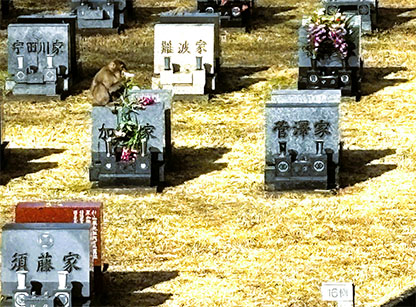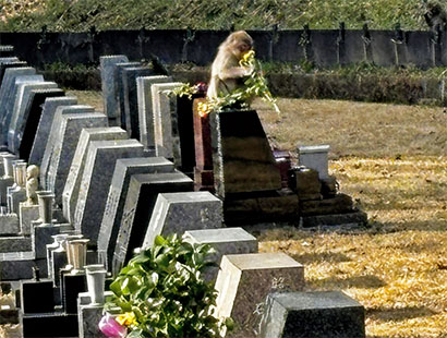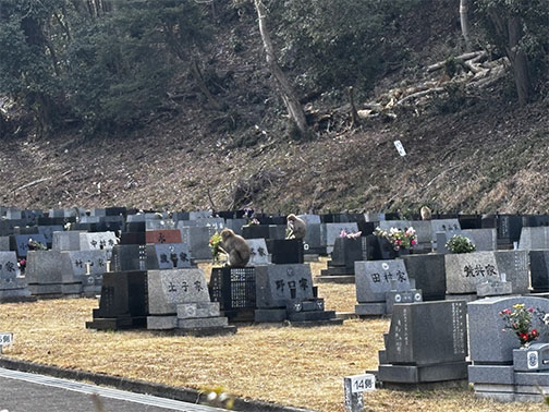 | 工学部応用理化学科1972 | 義父の墓参の折、サルが墓地にたくさん来ていました。スマホしかなく表情など写せなかったのが心残りでした。しかし、「報道写真はそこにいることが絶対条件」と出品させていただくことにしました。 <昭和47年卒 鉄人29号> |